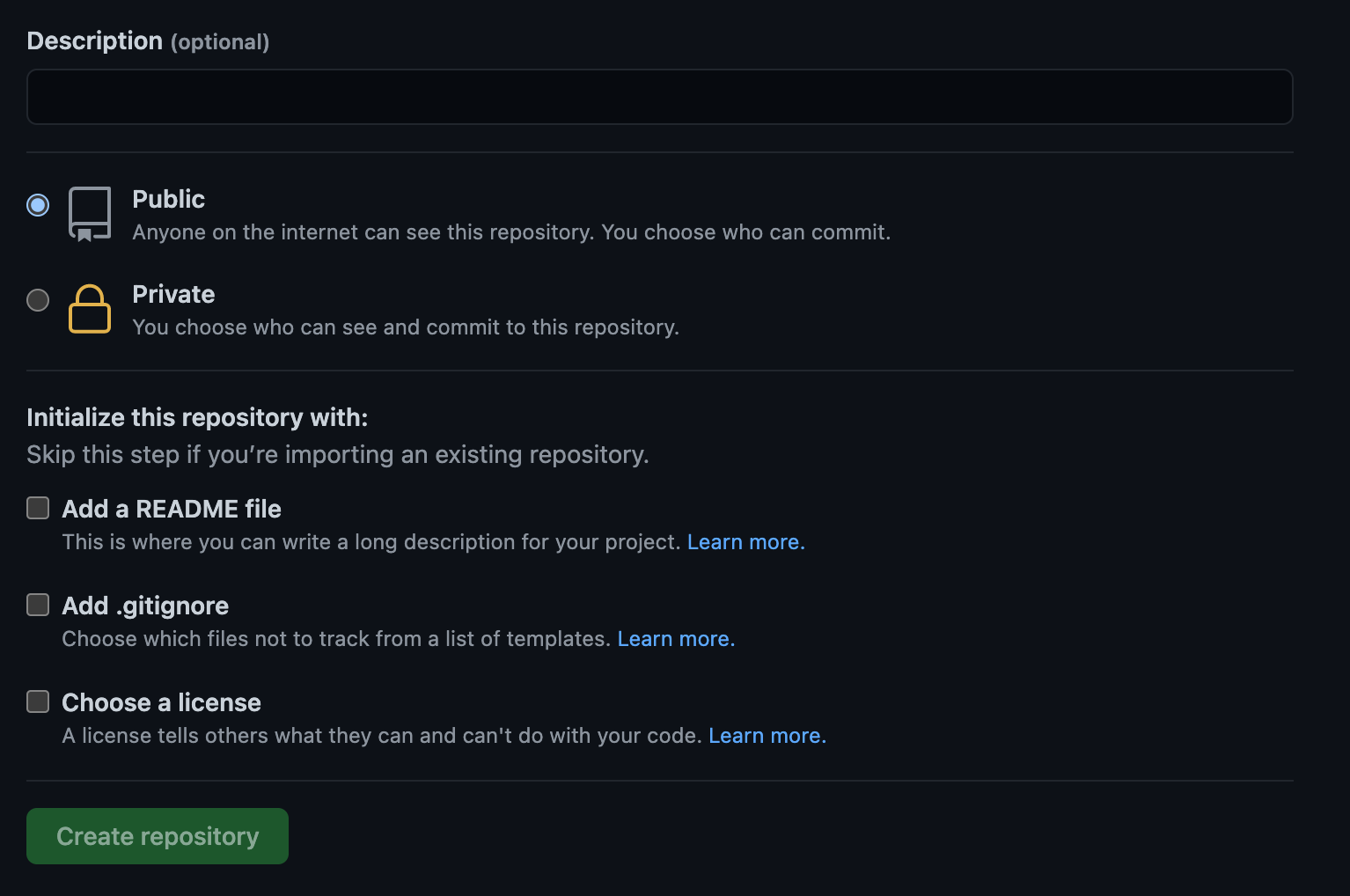 ๋ฆฌํฌ์งํ ๋ฆฌ ์ด๋ฆ๋ง ์ ๊ณ ์ค๋ช ๋ถ๋ถ์ด๋ Public/Private์ ์ํ๋ ๋๋ก ์ค์ ํ ๋ฆฌํฌ์งํ ๋ฆฌ ์ด๊ธฐํ ๋ถ๋ถ์ ์๋ฌด๊ฒ๋ ์ฒดํฌํ์ง ์๊ณ ์์ฑํด์ฃผ์๋ค.