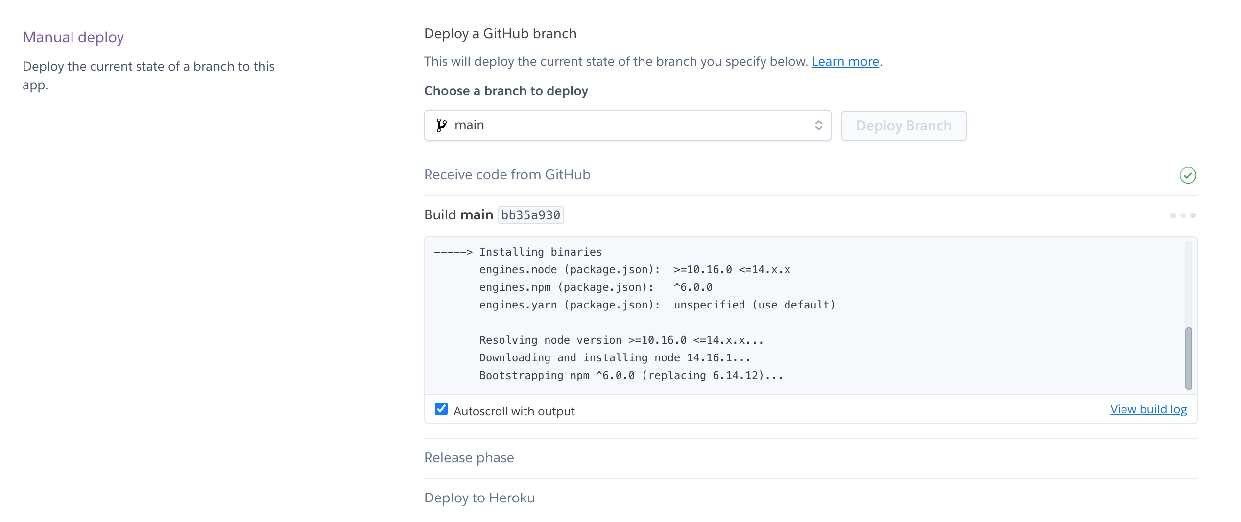 Deploy Branch ๋ฒํผ์ ํด๋ฆญํ๋ฉด ๋ก๊ทธ๋ฅผ ํ์ธํด๋ณผ ์ ์๋ค. ์๋ ๋ฐฐํฌํด๋ณด๊ณ ์๋ ๋ฐฐํฌ๋ฅผ ํ์ฑํ ์ํฌ ์๋ ์๋ค.