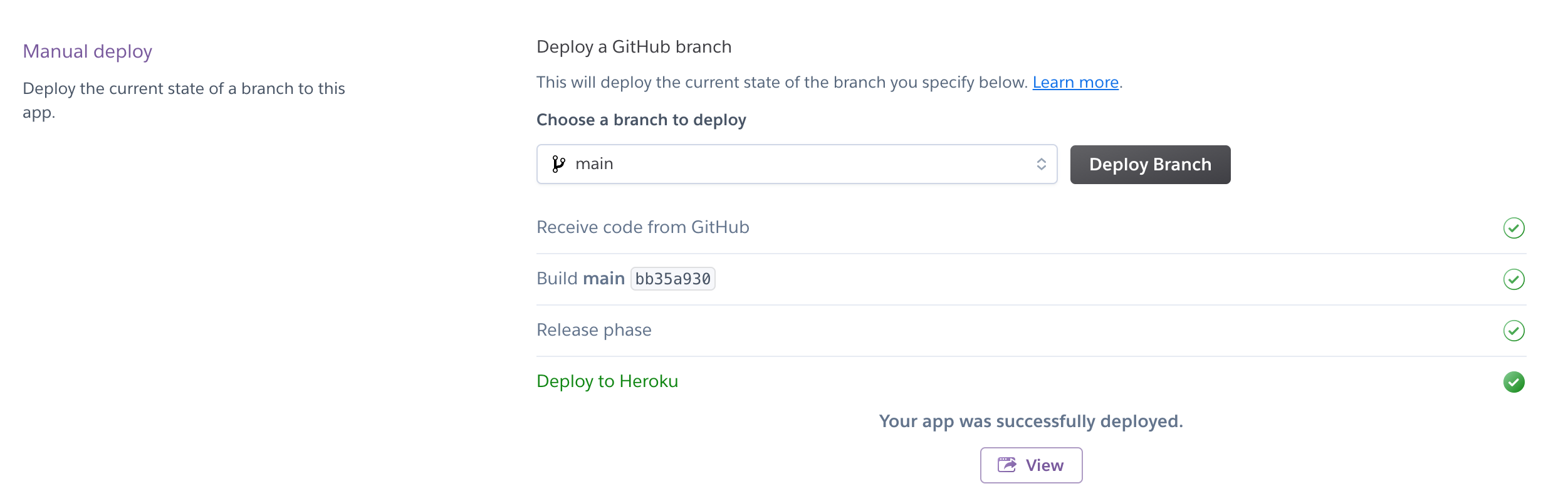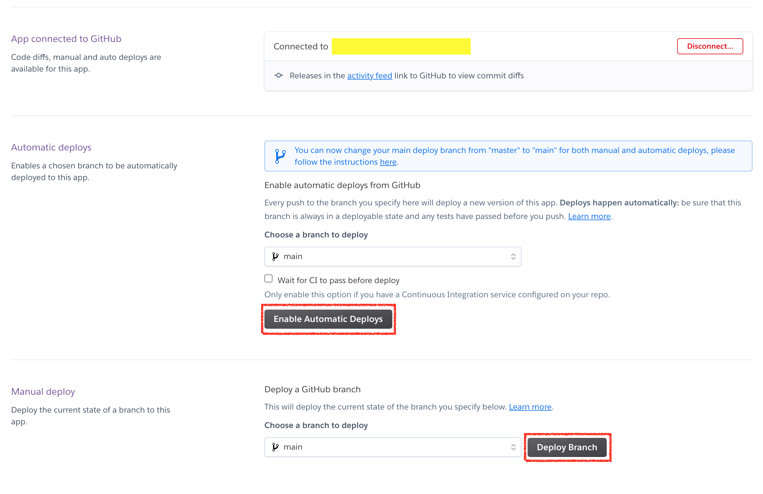 ํ๋จ์ Deploy Branch ๋ฒํผ์ ์ง์ ์๋ ๋ฐฐํฌํ๋ ๊ฒ์ด๊ณ Enable Automatic Deploys ๋ฒํผ์ ์๋ ๋ฐฐํฌ๋ฅผ ํ์ฑํํ๋ ๋ฒํผ์ด๋ค.