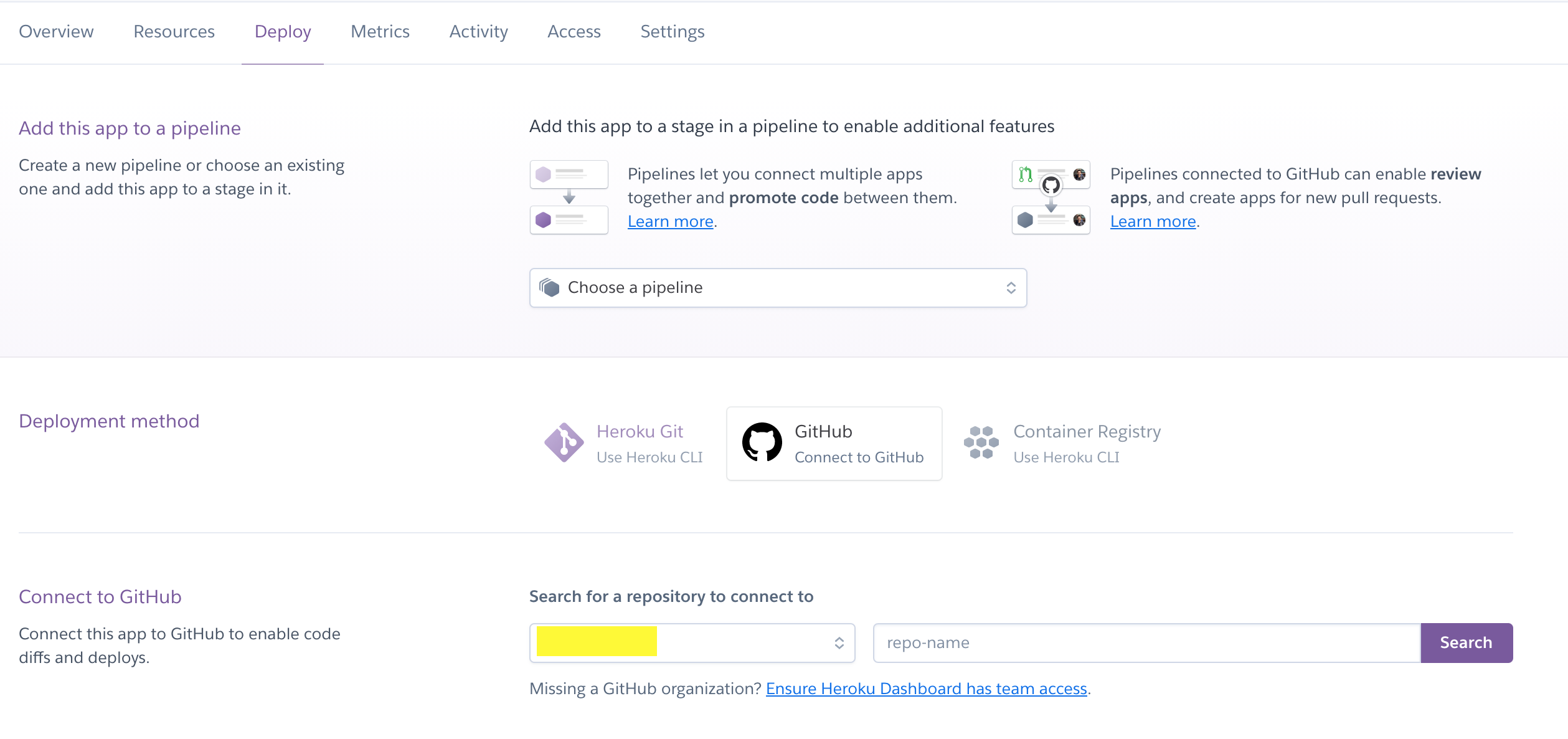 Deployment method๋ GitHub์ ์ ํํ๋ฉด ํ๋จ์ Connect to GitHub์ด ๋ณด์ธ๋ค.