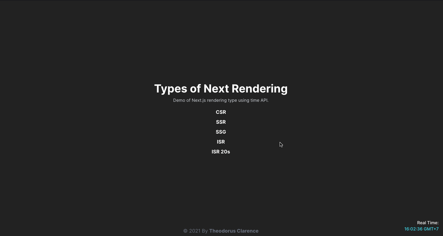 - ISR – Incremental Static Regeneration, this is a new thing, shortly put, a combination of SSG, and SSR, where it served statically, but at a certain time and certain condition that page will rebuild and fetch the data from the API again.