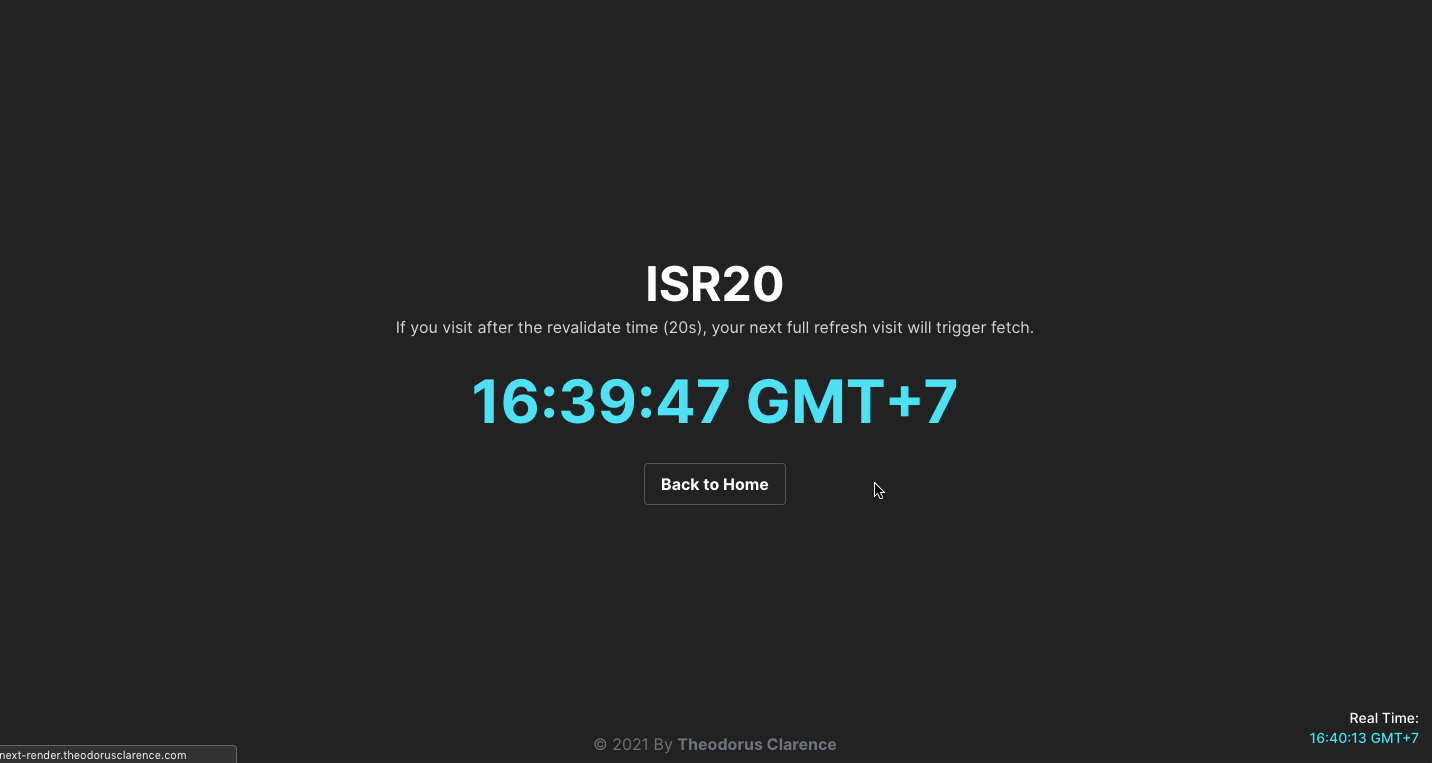 - First Reload at 16:40:36(RT), we know that it is not on the cooldown state anymore. The first visit after the cooldown state is off, is going to trigger page rebuild. Page rebuild meaning, only this certain page is going to be rebuild. Not the whole application. The fetch API will run in the background, but there will be no changes on the Preview Time
