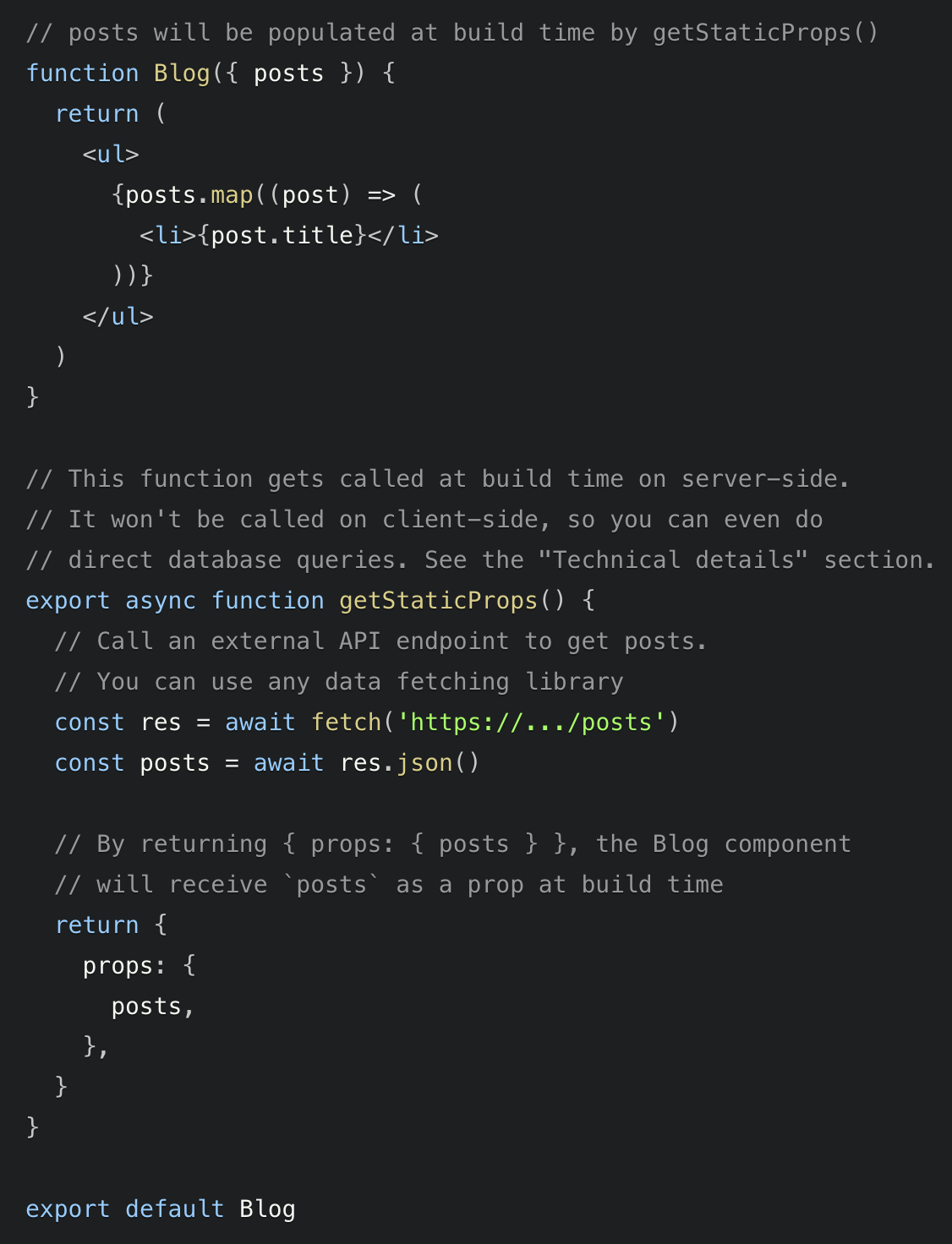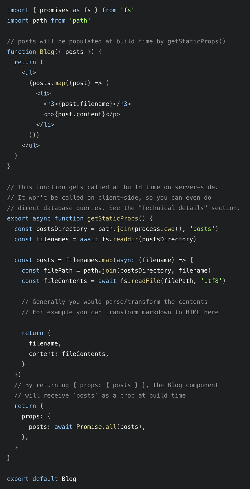Here’s an example which uses getStaticProps to fetch a list of blog posts from a CMS (content management system). This example is also in the Pages documentation.