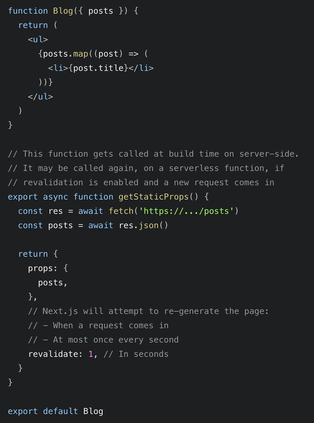 Now the list of blog posts will be revalidated once per second; if you add a new blog post it will be available almost immediately, without having to re-build your app or make a new deployment.