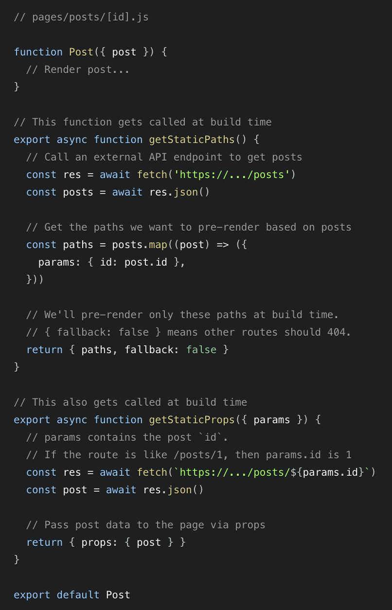 - params๋ ๋์ ๋ผ์ฐํ ์ ์ฌ์ฉํ ๊ฒฝ๋ก ํ๋ผ๋ฏธํฐ๋ฅผ ํฌํจํ๊ณ ์๋ค. ์๋ฅผ ๋ค๋ฉด ๋ง์ฝ ํ์ด์ง ์ด๋ฆ์ด [id].js์ด๋ฉด params๋ {id:...}์ ๊ฐ์ ๊ฒ์ด๋ค. ๋ ์์ธํ ์์๋ณด๊ธฐ ์ํด์ Dynamic Routing documentation์ ์ฐธ์กฐํ๋ผ. getStaticPaths์ ํจ๊ป ์ฌ์ฉํด์ผ๋ง ํ๋ค. ์ถํ์ ์ค๋ช ํ ๊ฒ์ด๋ค.